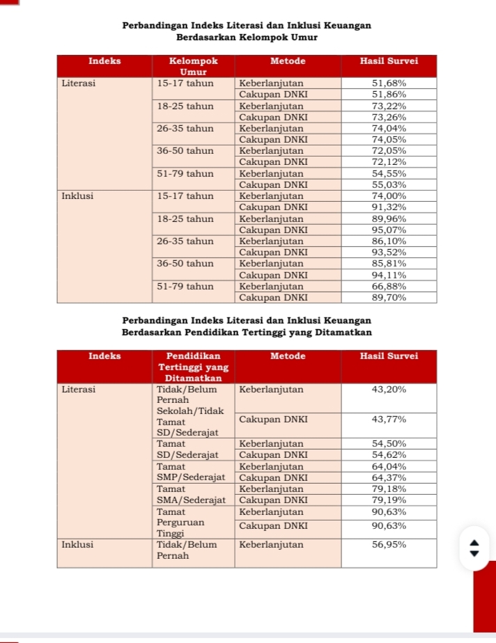 – Kelompok dengan pendidikan tidak/belum pernah sekolah/tidak tamat SD/sederajat memiliki indeks literasi keuangan terendah sebesar 43,20% dan indeks inklusi keuangan terendah sebesar 56,95%.