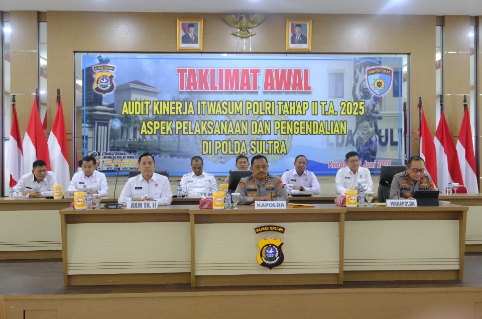 Kendari – Inspektorat Pengawasan Umum (Itwasum) Polri melaksanakan audit kinerja di Polda Sulawesi Tenggara (Sultra) pada Senin, 16 Juni 2025. Kegiatan tersebut berlangsung di Aula Dhacara Polda Sultra dalam agenda *Taklimat Awal Audit Kinerja Itwasum Polri Tahap II Tahun Anggaran 2025* dengan fokus pada aspek pelaksanaan dan pengendalian.