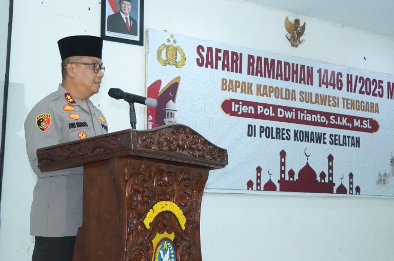 KONAWE SELATAN – Kapolda Sulawesi Tenggara (Sultra), Irjen Pol. Dwi Irianto, S.I.K., M.Si, bersama Wakapolda Sultra Brigjen Pol Amur Chandra Juli Buana, S.H., M.H beserta pejabat utama Polda Sultra melaksanakan Safari Ramadan di Polres Konawe Selatan (Konsel), Kamis (6/3/2025). Safari Ramadhan ini dihadiri Bupati Konsel Irham Kalenggo, Wakil Bupati Wahyu Ade Pratama Imran, Forkopimda, serta tokoh agama dan masyarakat.