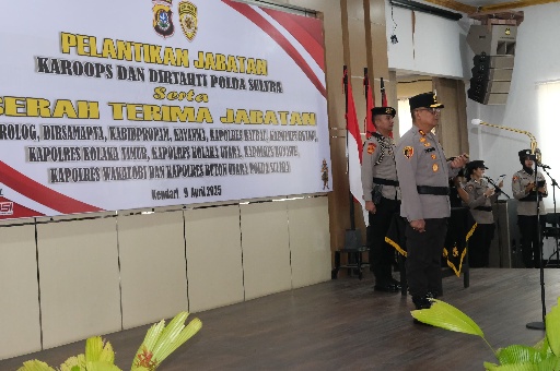Kendari — Kapolda Sulawesi Tenggara (Sultra), Irjen Pol Dwi Irianto, S.I.K., M.Si., memimpin langsung pelaksanaan serah terima jabatan (sertijab) sejumlah pejabat utama Polda Sultra dan Kapolres di wilayah jajarannya, pada Rabu, 9 April 2025. Kegiatan yang berlangsung di Aula Dachara Polda Sultra ini turut dihadiri oleh Wakapolda Sultra Brigjen Pol Amur Chandra Juli Buana, S.H., M.H., Irwasda Kombes Pol Hartoyo, S.I.K., para pejabat utama Polda, jajaran Kapolres, serta personel lainnya.