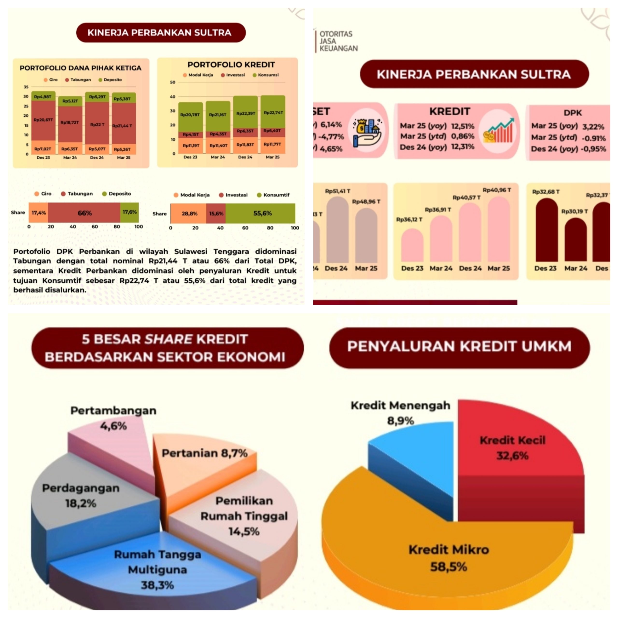 Kendari,- Otoritas jasa keuanganKinerja perbankan di Sulawesi Tenggara menunjukkan pertumbuhan positif secara year on year (yoy) pada beberapa indikator utama. Aset, kredit, dan Dana Pihak Ketiga (DPK) masing-masing tumbuh sebesar 6,14%, 12,51%, dan 3,22%.