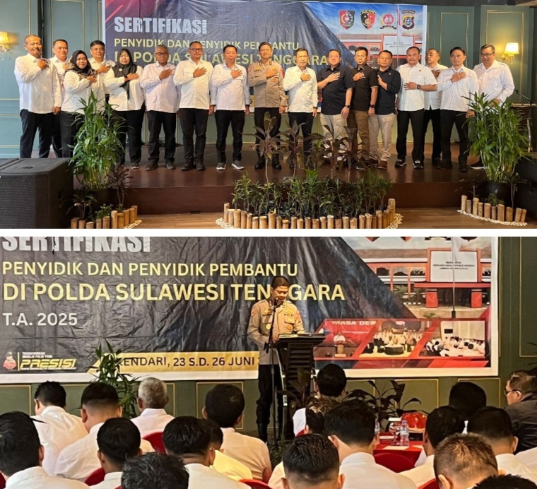 Kendari – Dalam rangka meningkatkan profesionalisme dan kompetensi personel, Kepolisian Daerah Sulawesi Tenggara (Polda Sultra) menggelar kegiatan **Sertifikasi Penyidik dan Penyidik Pembantu** pada Selasa, 24 Juni 2025, bertempat di Swiss-Belhotel Kendari. Kegiatan ini dipimpin langsung oleh **Irwasda Polda Sultra Kombes Pol Hartoyo, S.IK** dan dihadiri oleh Pejabat Utama (PJU) Polda Sultra.